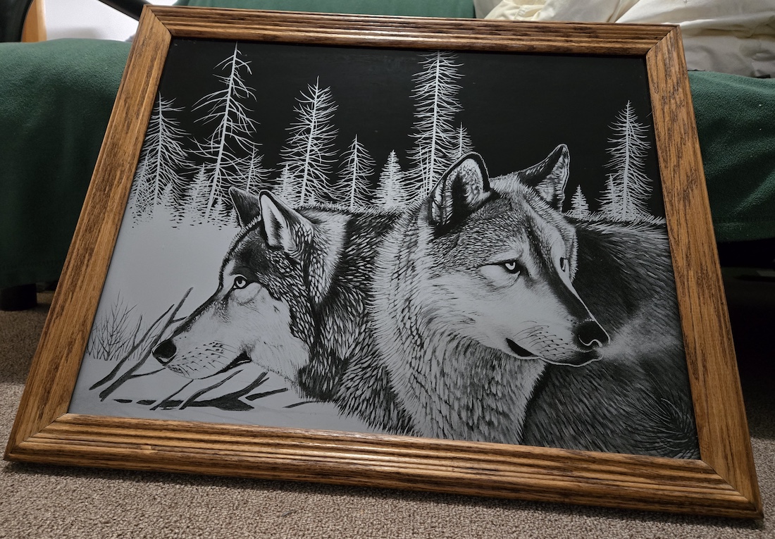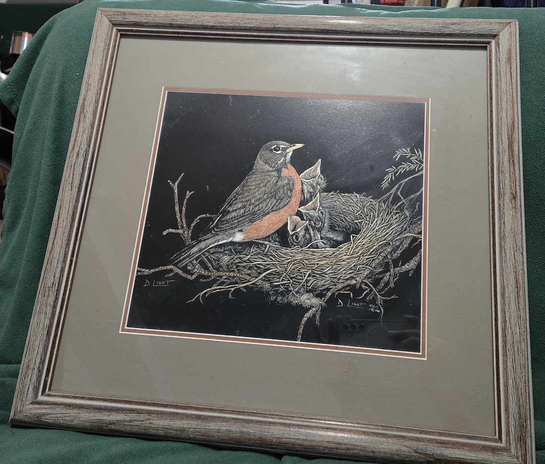 I won two art pieces from my Uncle Tom’s estate auction. They will go on my walls along with my Uncle Joe’s and other art. The first one was the wolf piece I wanted, a mirror etching by Danny Pierce called Blue Morning Trackers. The other was a scratchboard by D Liszt of a robin and nestlings. My Uncle had a lot of D Liszt pieces. Not sure where he or my Aunt found them. I wanted something contrasty and the wolf piece especially hits that. I like them both.