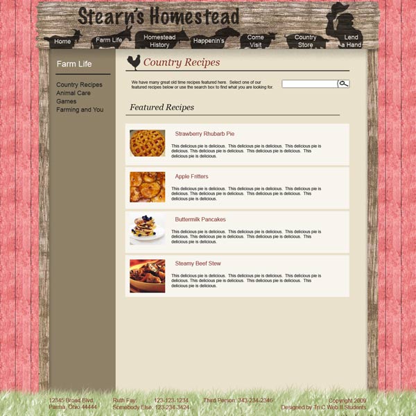 The recipes page of this design. I figured the recipes would each be a separate page on the site, with either links to featured recipes or categories on the main page and a search box to find recipes. I drew the search icon in Photoshop on the suggestion of my classmates, as they didn’t like the text button I had. This, like most of my content elements, was used on all designs.