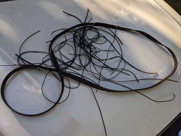 They had a belt, which I bought. Since I planned to make it to my parents’ with the old belt, I tried pulling off the new strands that had separated, but unfortunately the belt partly slipped off of the pulley. I struggled to get it back on until I finally found the tensioner pulley and figured out how to get it to work. I luckily had the correct sized socket and wrench in case something went wrong with my recent wheel hub replacement. I was able to get the belt back on, but unfortunately, after starting the vehicle, the belt popped off entirely. So I was left with little choice but to install the new belt.