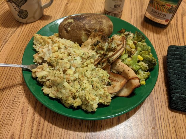 I baked my dinner, kind of winging it with what I had. The baked potato was the longest cooking thing, so I started that first, with some salt and oil, at 450° in the oven. Then about 35 minutes later I added some broccoli, corn, and onions tossed in some oil and salt and spices to the same pan. A little bit later I put some sliced turkey on a separate pan, put on some salt and spices, and put them in the oven as well. I started the Stovetop stuffing, but didn’t realize how quick it was, and let it sit for a while.