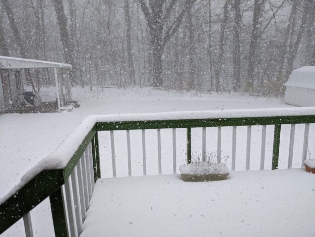 Spring snow covers the deck and yard