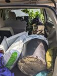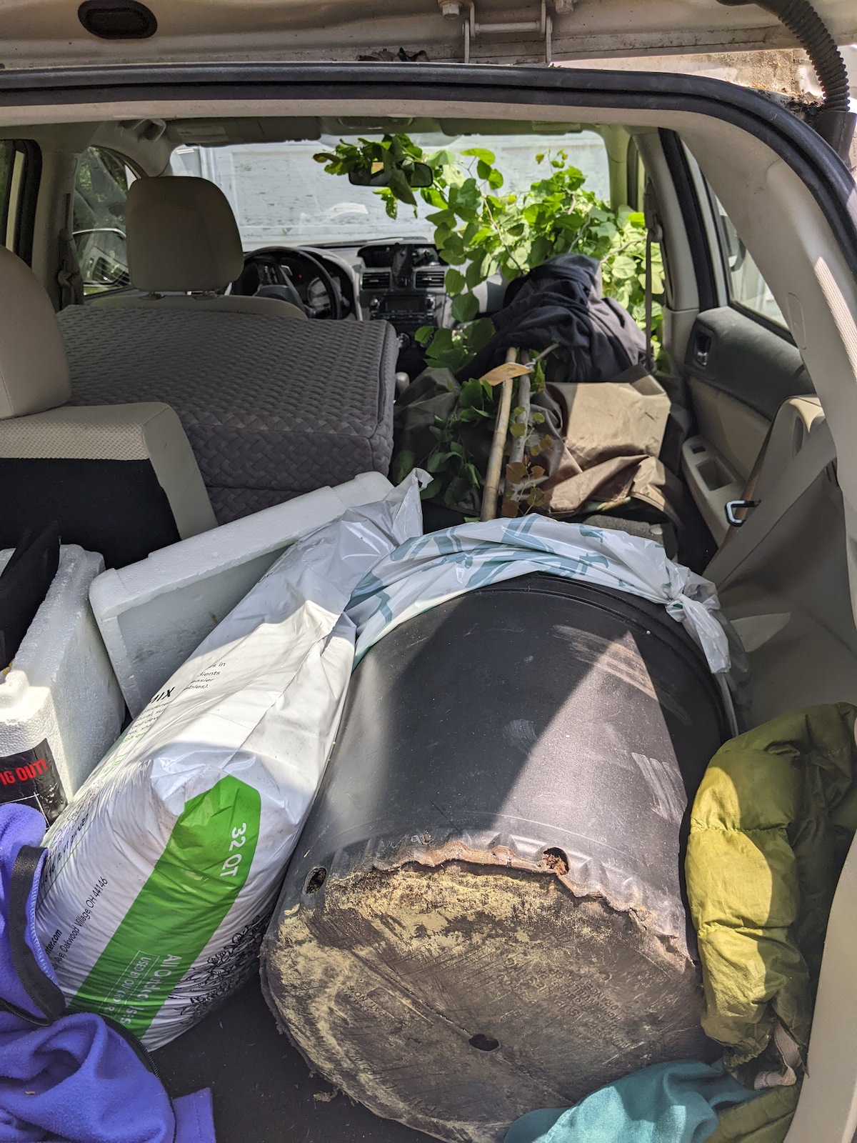I found some redbuds at Petitis in the spring, and thought they looked quite nice, if pricey. I hadn’t been able to find them at the closer Grafs or other places I looked. Saturday, I went to a bird event in Twinsburg, and when navigation brought me back on Route 8 to Tallmadge, I decided I might as well go get more details about the redbuds at Petitis. They were a little taller than I thought, maybe 6′ above the pot, which should mean quicker to get to a nice height, but harder to transport. After talking to them and thinking a bit, I decided to buy right then, as a present to myself for recent events. $180 plus a $16 bag of planting mix plus taxes. I asked about getting them delivered and installed. They wouldn’t do installation, but would deliver for $70. I just had my Impreza hatchback and asked about fitting it in that. I decided to try, with a fallback plan of delivery if it didn’t work. Luckily, the two guys were able to help me fit it in, and it worked fine, although I had leaves blocking part of my windshield for the drive home.