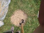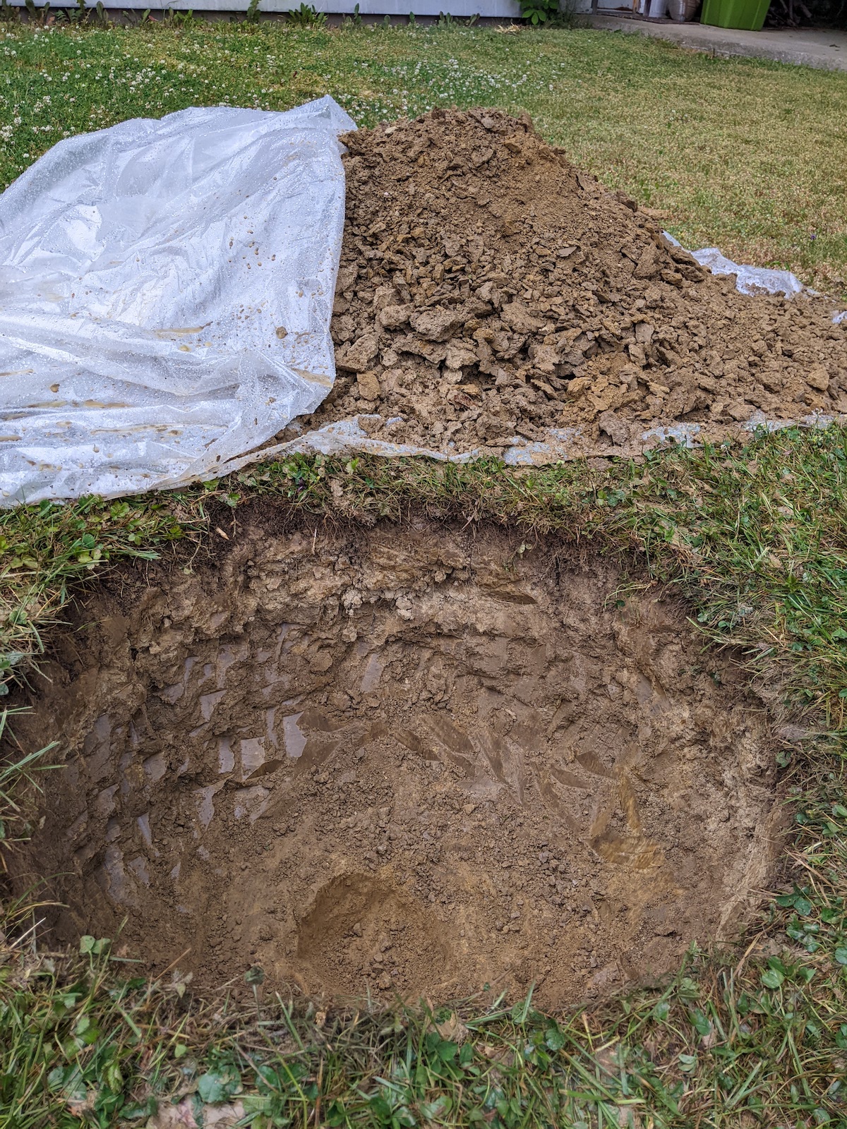 At my spot, I measured out and marked the 28″ diameter the instructions with the pot suggested. I cut a circle-ish shape in the lawn with my hori-hori and used my full spade to lever out clumps of turf. They were dry and took some working. Then I had a circle of solid clay to dig. This was the part that took most of the time. I attacked it with the spade, but it was really hard and I was just able to break small bits at a time, except for some random spots where it was a little bit loose or had a weak vein. It was very slow going and hard on my wrists. I tried to break it up with my hori-hori, but that only really helped near the edges, especially once I got some walls to attack. Eventually, I took a hatchet in there to break things up faster. It was generally just creating cuts or breaking off small bits. I also tried wetting it, which definitely helped in spots but also sometimes just didn’t soak in or made the clay heavy.