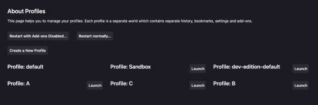 Firefox allows us to create multiple browser profiles to separate our activities, such as work, personal, finance, etc. It has an about:profiles page to manage and launch these. The page has not gotten much UX love and does not make very good use of space. On load, I can’t see the full second profile on my laptop (Macbook) screen. After living with this a long time, I decided to use userContent.css to customize the appearance so everything fits on one screen and I can quickly and easily find the two things I need most of the time: Each profile’s name, and the button to launch it with.